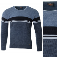 Sweter męski z okrągłym dekoltem pod szyję niebieski pasy wełniany klasyczny ciepły - Reymo