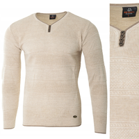 Sweter męski z okrągłym dekoltem krótkie zapięcie na guziki beżowy pasy klasyczny - Devanti